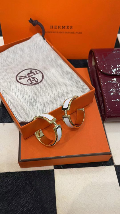 Hermès metal H letter white leather earrings-3714
