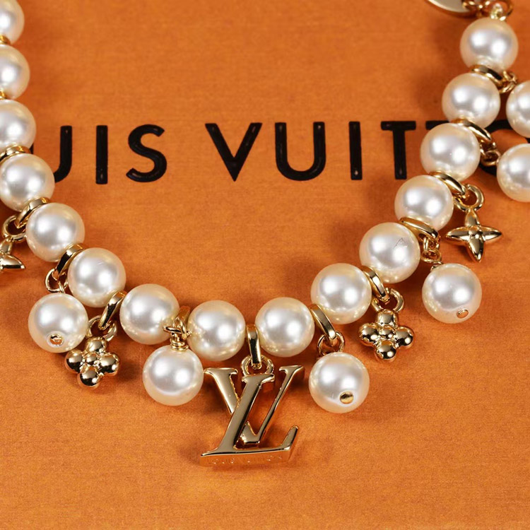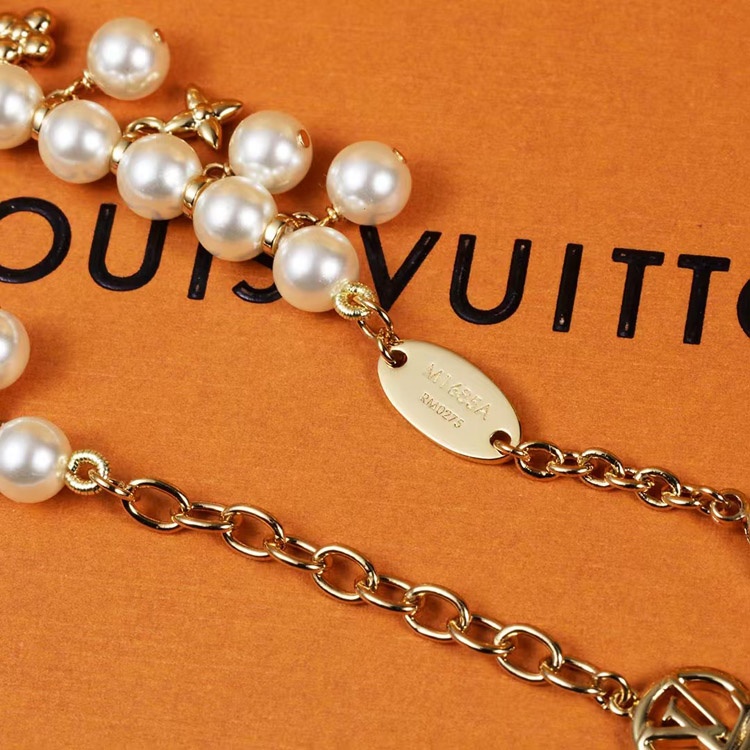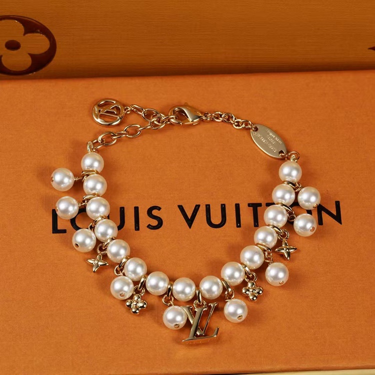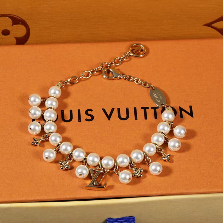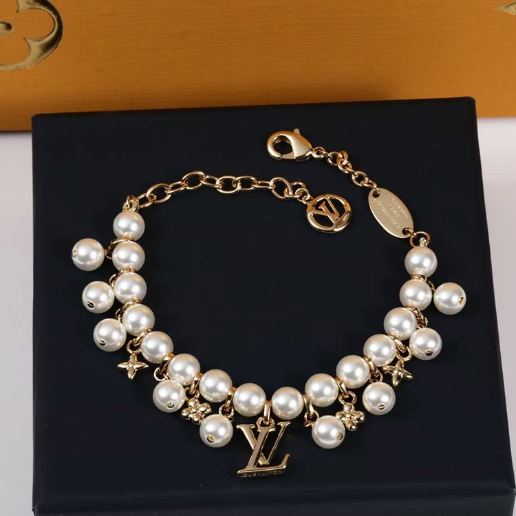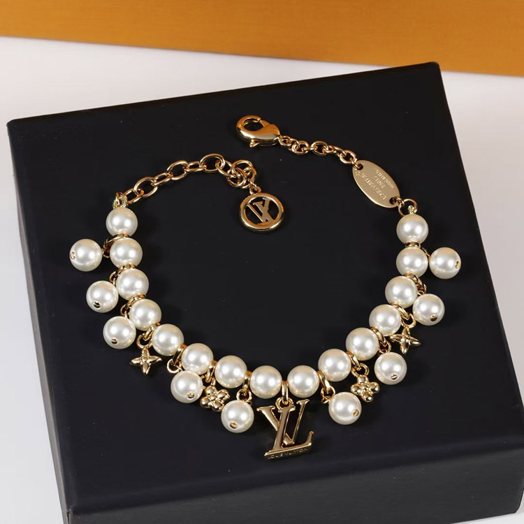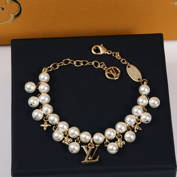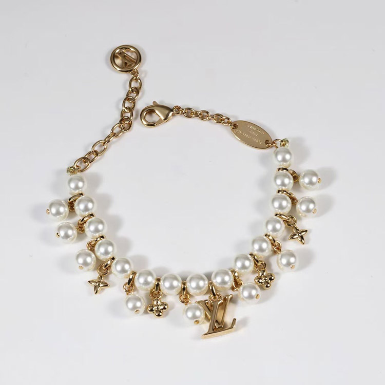 Louis Vuitton LV gold metal fine chain pearl letter flower pendant bracelet-3655